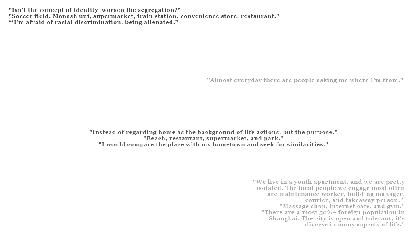 After the interview, not surprisingly, I realized my friends all lived in different degrees of isolation, in both physical and social aspects. However, public life is not fully absent from their lives. Their social comfort zone starts from their apartments and expands to university campuses, public amenities, and local enterprises. But how come the contact remains at a superficial level? Why do belongingness and the sense of home still hard to gain?